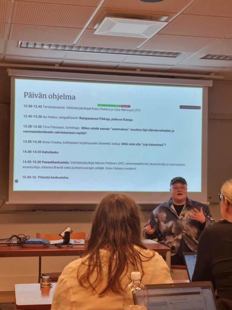 ‘Rampautunut Pinkoja, pinkova Rampa’, vammaisfilosofinen puheenvuoro Crip-käsitetyöpaja -tapahtumassa. Järjestäjinä MadEnCounters -hanke ja Selma-verkosto ym. Marraskuu 2025. (Turun yliopisto.)