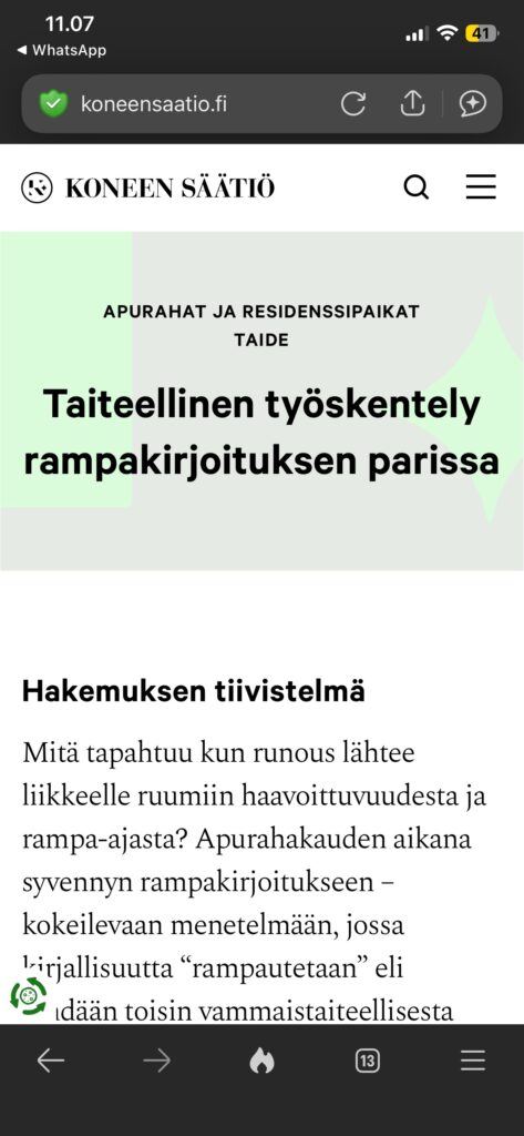 ENG: Kone Foundation’s grant for artistic work, for 1 year, 32400 EUR. Project: Artistic work with crip writing.