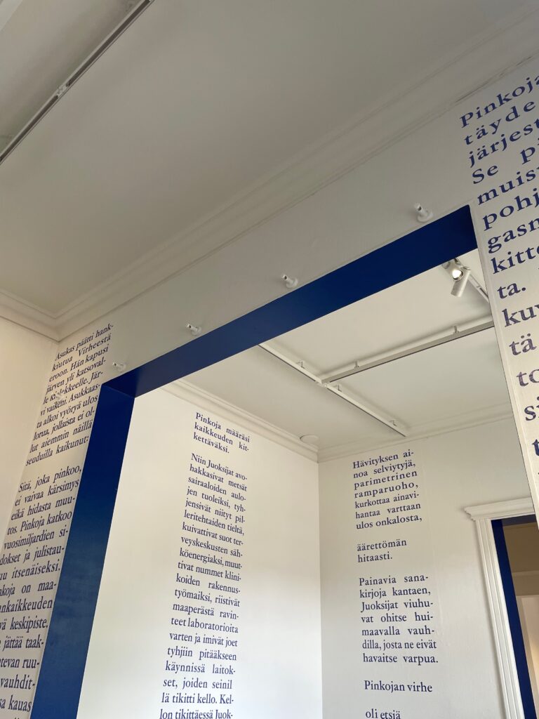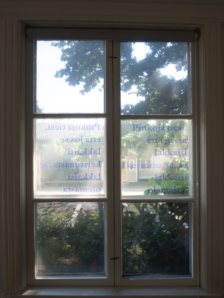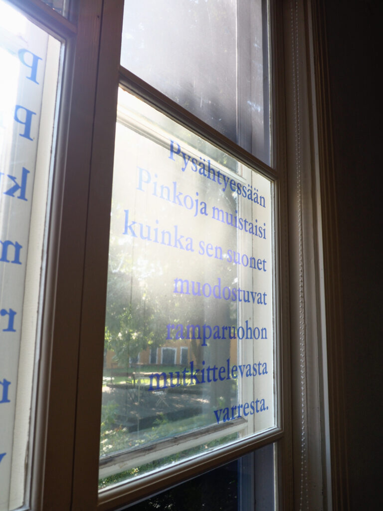- Teksti-installaationa seinillä ja ikkunoissa (kirjainteippaus).